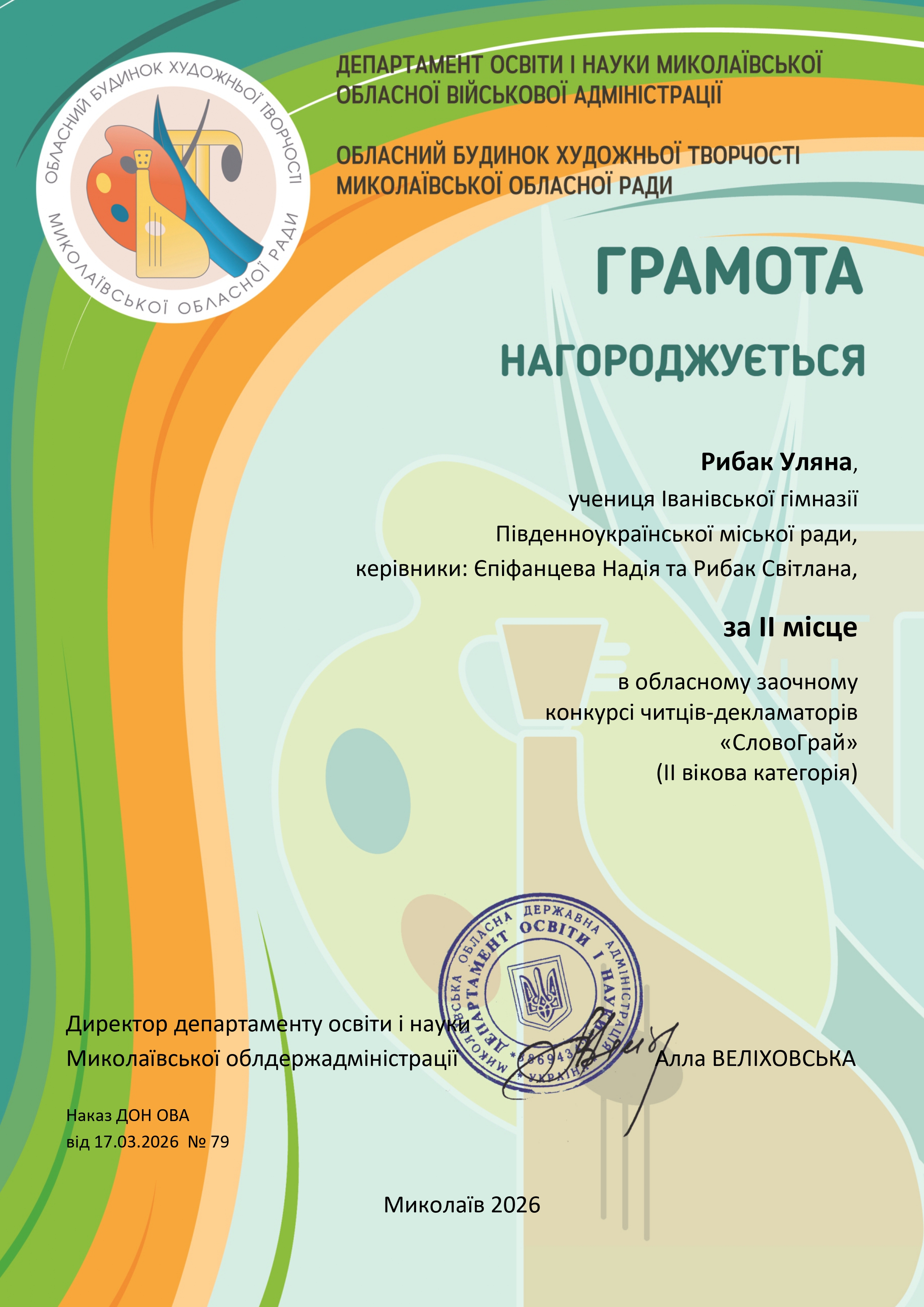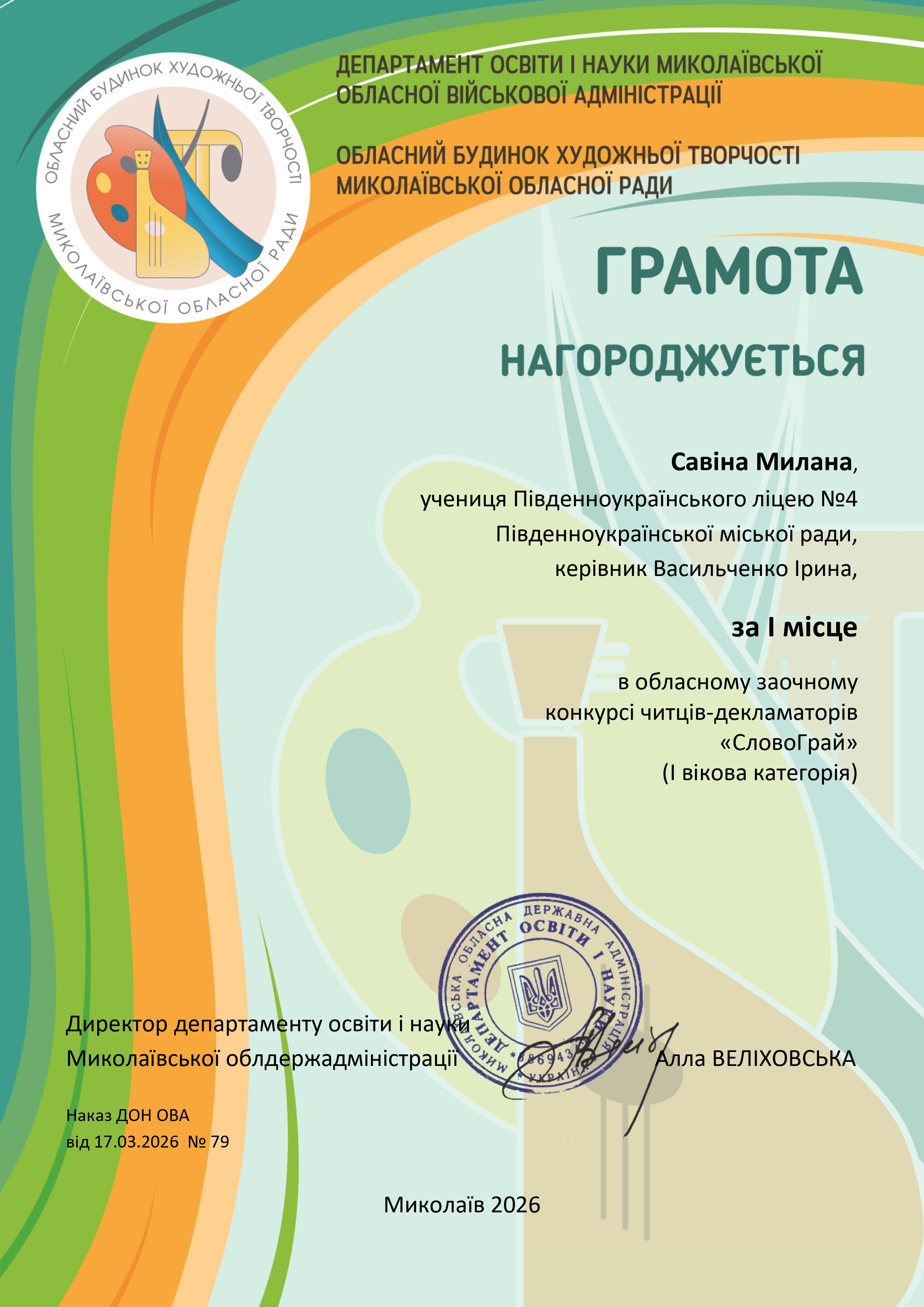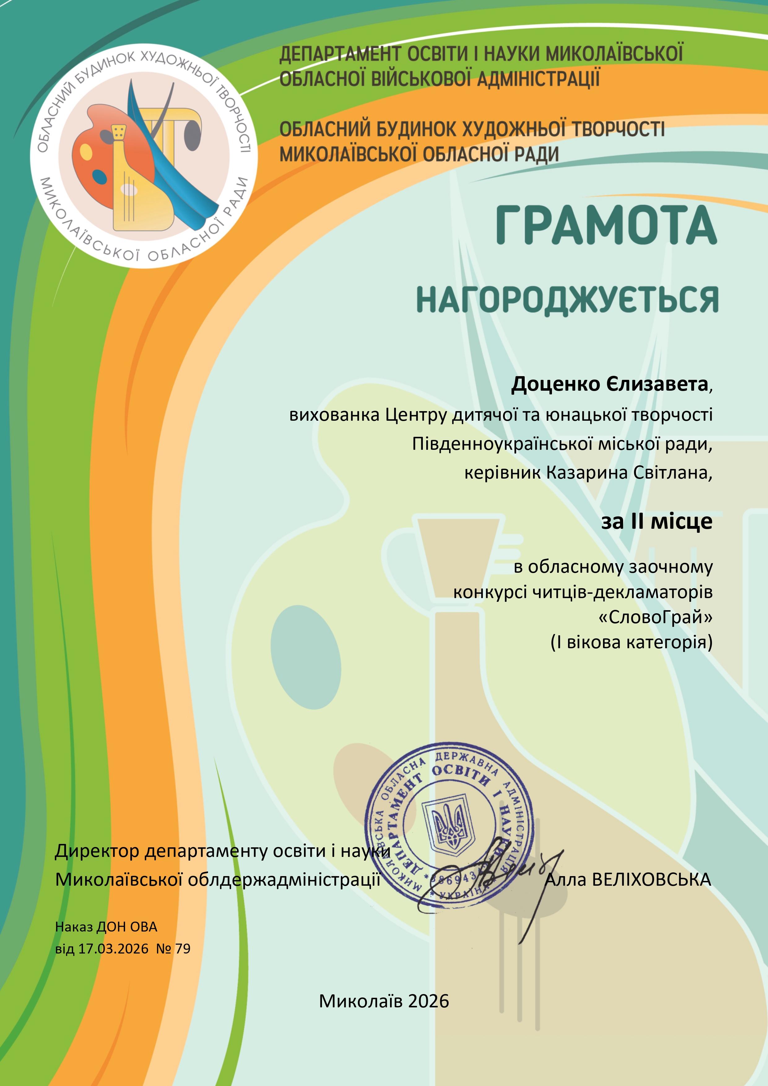 З метою пошуку та підтримки талановитої, обдарованої молоді, становлення самодостатнього громадянина-патріота України, вшанування пам’яті видатних українських поетів, популяризації творчості сучасних українських авторів, які своєю поезією виховують у молодого покоління патріотичний дух та любов до рідної країни, з 13 січня по 23 лютого 2026 року обласним Будинком художньої творчості Миколаївської обласної ради, проведено обласний етап заочного конкурсу читців-декламаторів "СловоГрай". Південноукраїнську громаду представили три учасниці, які продемонстрували творчі здібності, високий рівень підготовки, володіння основами художнього читання, уміння тримати увагу глядачів та сценічну культуру.