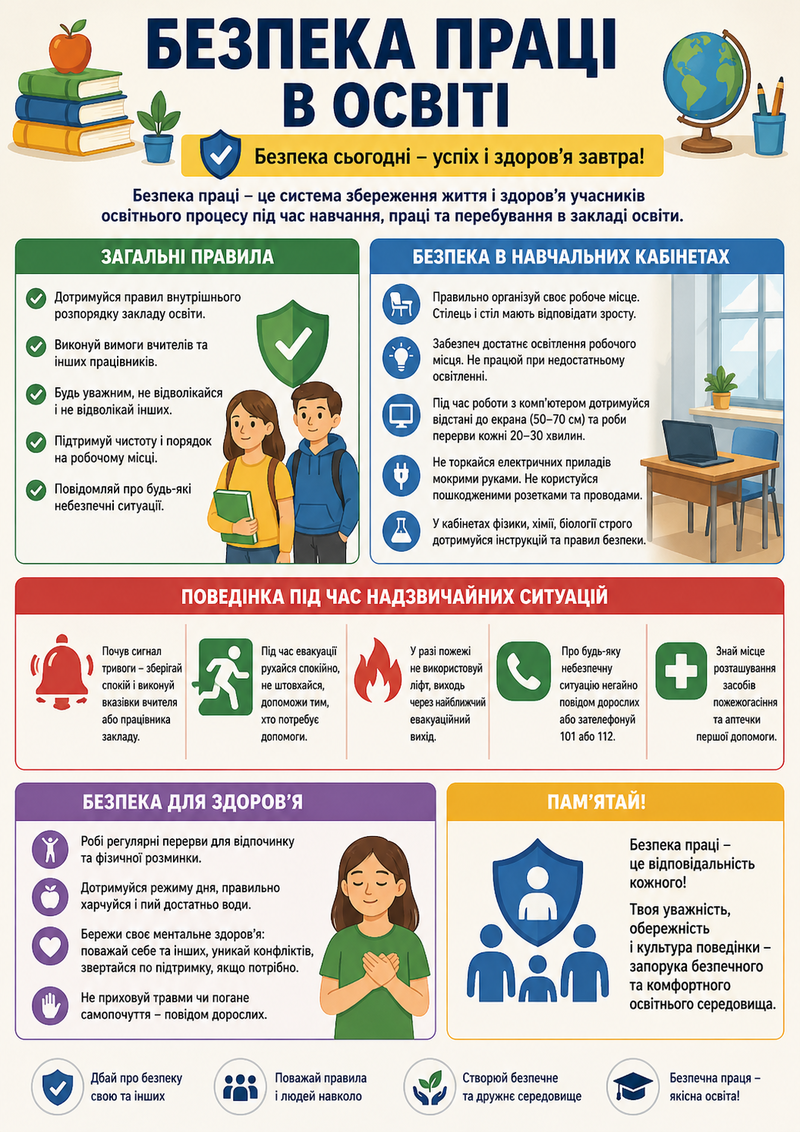 На виконання наказу управління освіти імені Бориса Грінченка Південноукраїнської міської ради від 16.04.2026 №326 «Про затвердження заходів до Дня охорони праці в управлінні освіти імені Бориса Грінченка Південноукраїнської міської ради» щодо організації та проведення заходів на підвищення рівня безпеки працівників, а саме: