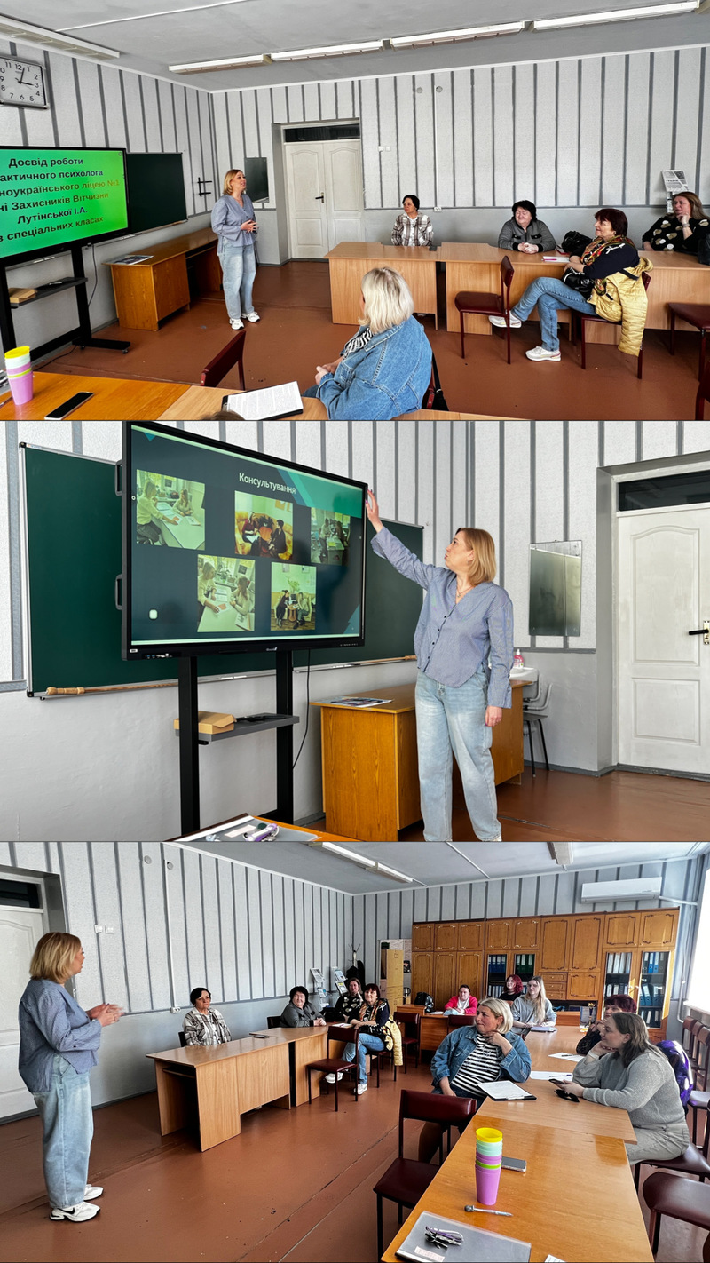 Практичні психологи ознайомили учасників засідання з форматом здобуття освіти в умовах корекційного класу та інклюзивної форми навчання, представили як позитивні сторони, так і існуючі недоліки, також виконали різноманітні практичні вправи щодо взаємодії з дітьми, ефективні завдання з розвитку памʼяті, концентрації уваги, психокорекційні вправи.