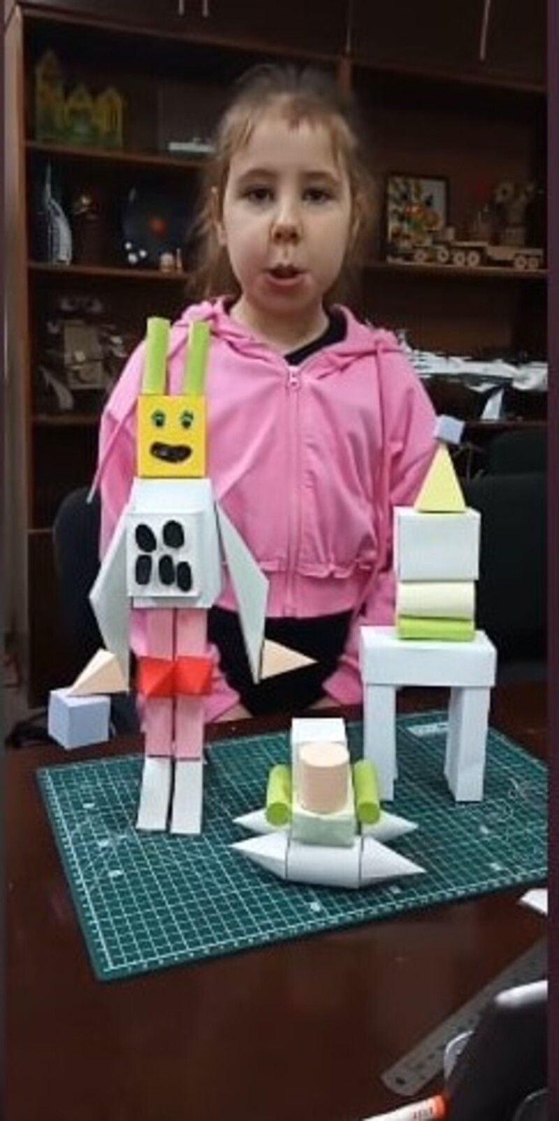 Творче завдання включало в себе створення композиції за власним задумом з певних геометричних фігур. Творчий етап змусив поглянути на звичайні фігури під іншим кутом. Вихованка гуртка Кіра САННІКОВА створила власну композицію «Робот -