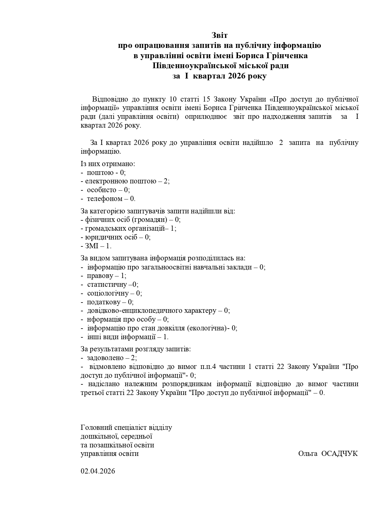 Звіт про опрацювання запитів на публічну інформацію в управлінні освіти імені Бориса Грінченка Південноукраїнської міської ради за І квартал 2026 року