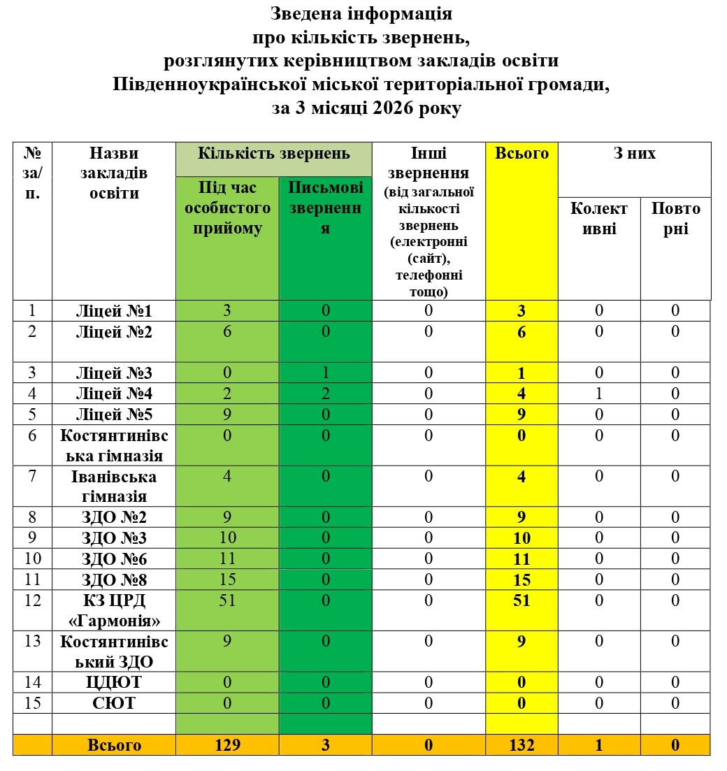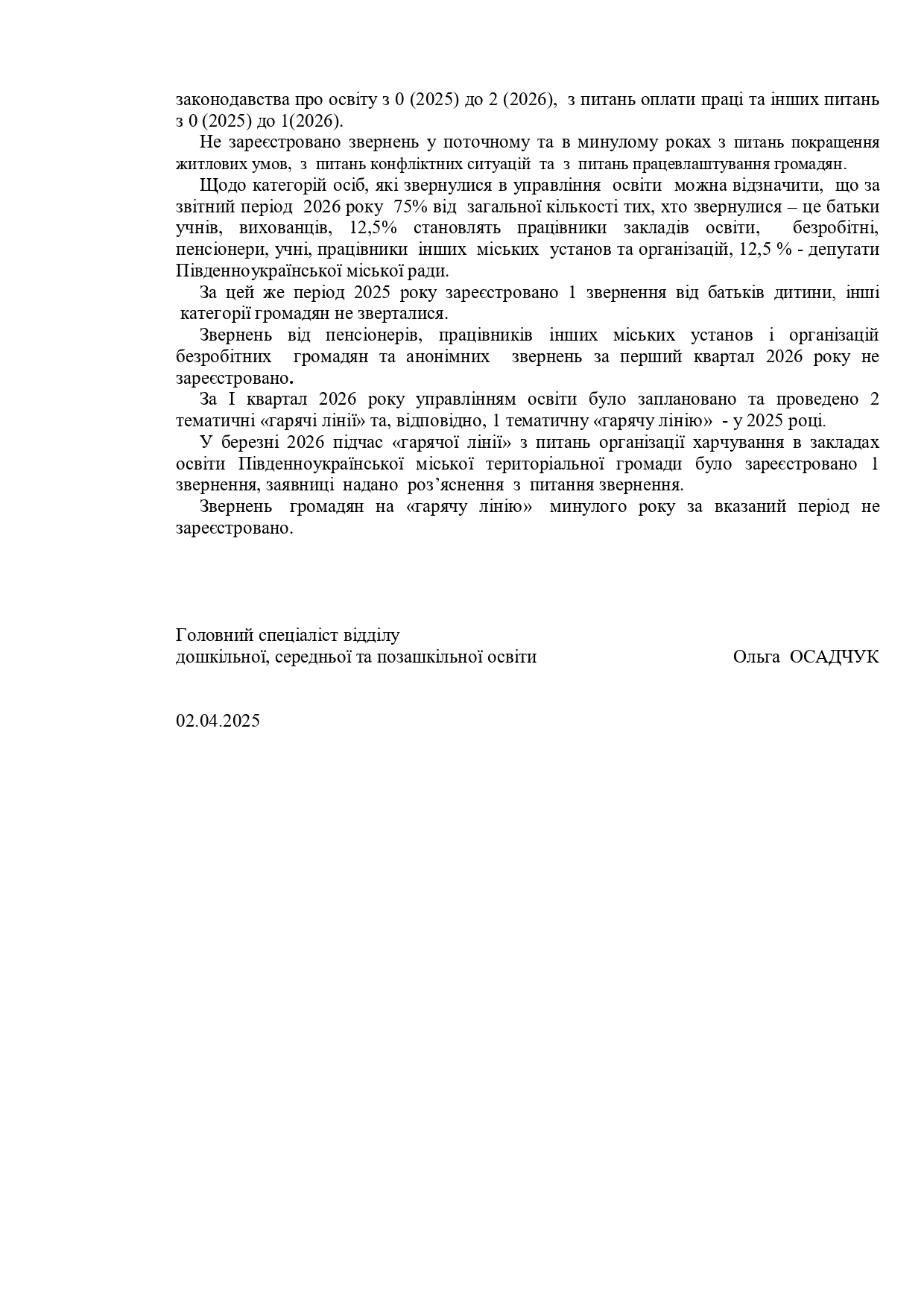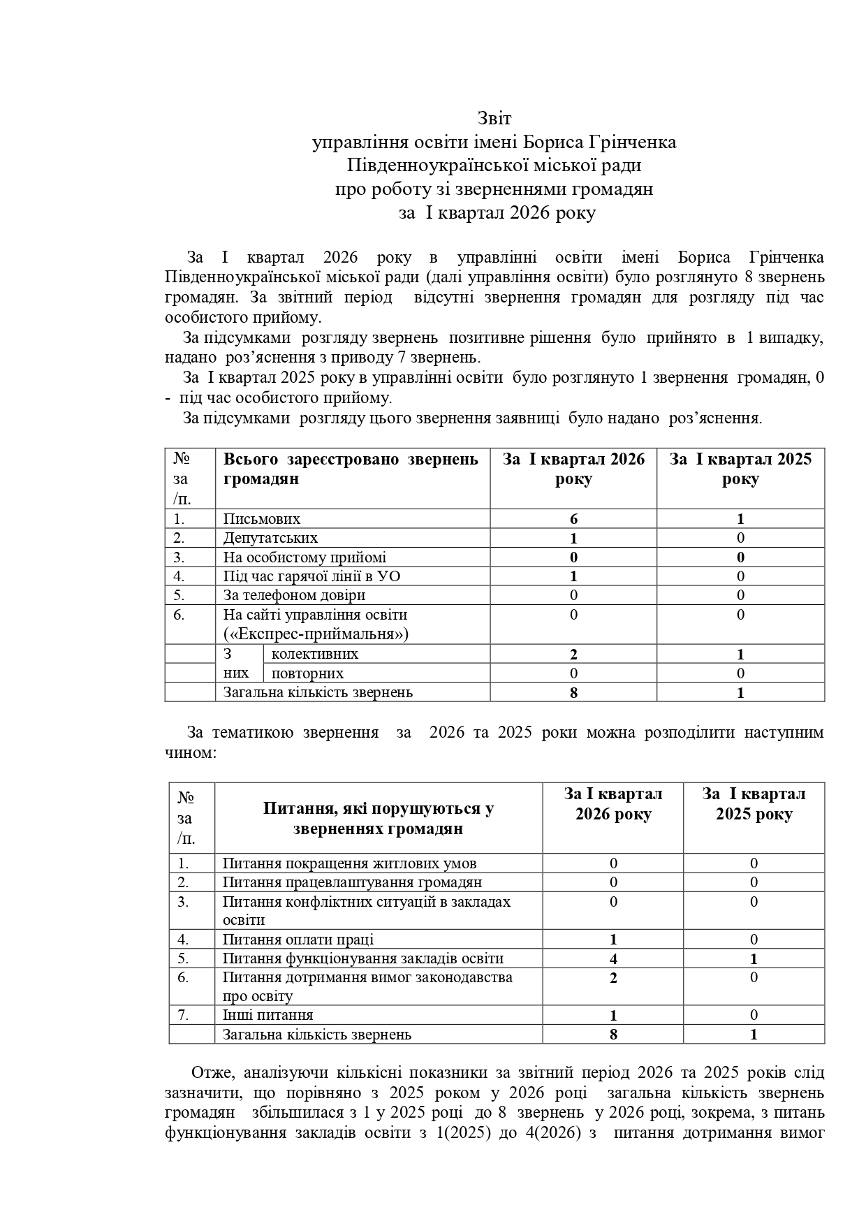 Звіт управління освіти імені Бориса Грінченка Південноукраїнської міської ради про роботу зі зверненнями громадян за І квартал 2026 року