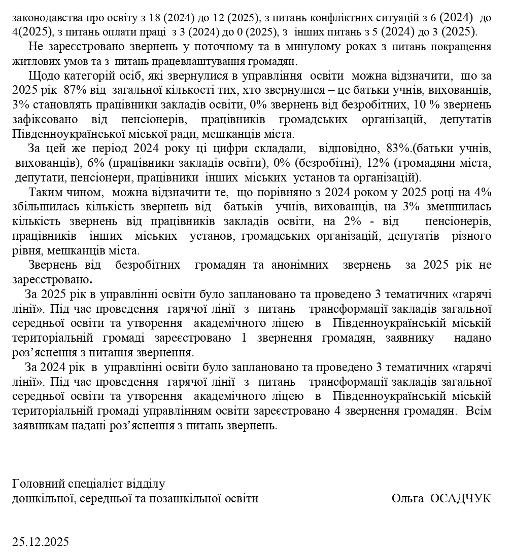 Звіт управління освіти імені Бориса Грінченка Південноукраїнської міської ради про роботу зі зверненнями громадян за 2025 рік