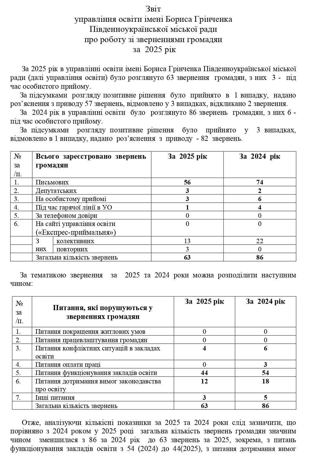 • Звіт управління освіти імені Бориса Грінченка Південноукраїнської міської ради про роботу зі зверненнями громадян за 6 місяців 2025 року