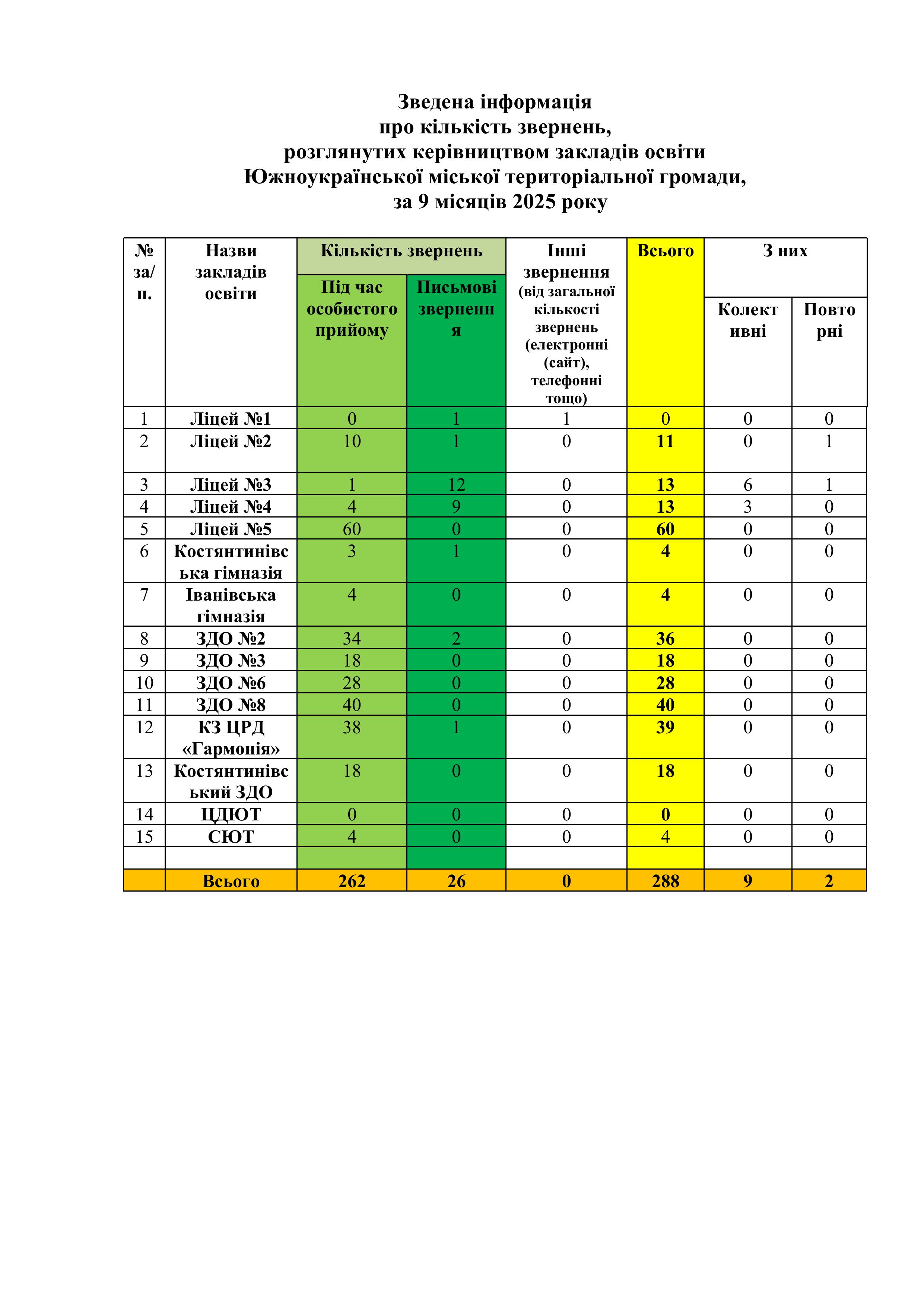 Зведена інформація про кількість звернень, розглянутих керівництвом закладів освіти Южноукраїнської міської територіальної громади, за 9 місяців 2025 року