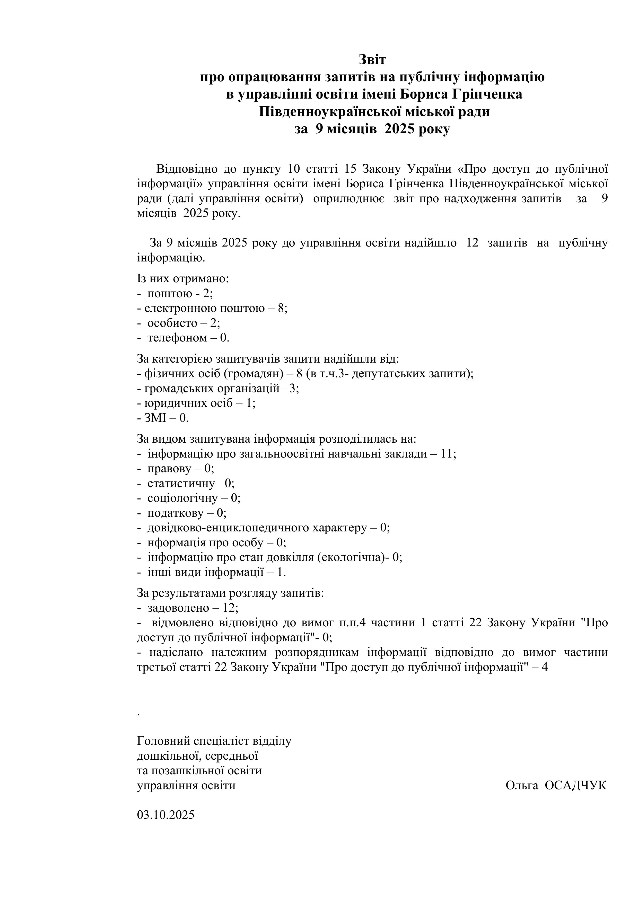Звіт про опрацювання запитів на публічну інформацію в управлінні освіти імені Бориса Грінченка Південноукраїнської міської ради за 9 місяців 2025 року