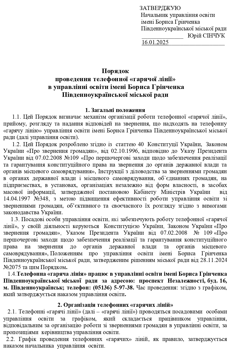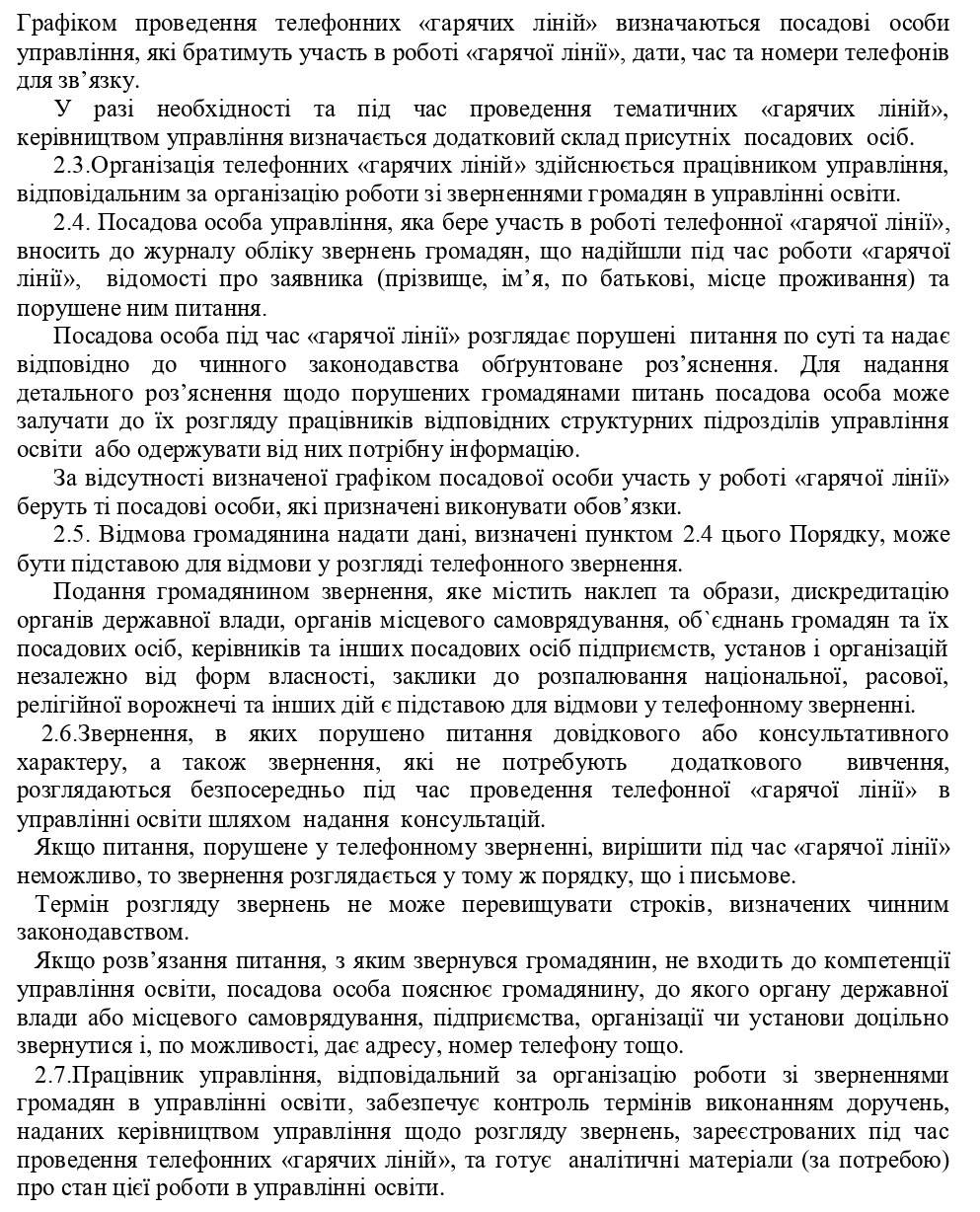 Порядок проведення телефонної "гарячої лінії" в управлінні освіти